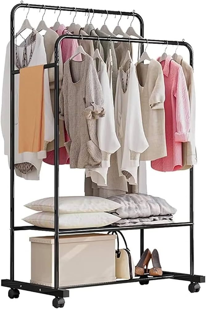 حامل ملابس معدني بعجلات 360°، هيكل متين، رفوف واسعة، تصميم أنيق وسهل النقل لترتيب ملابسك بمرونة وأناقة.