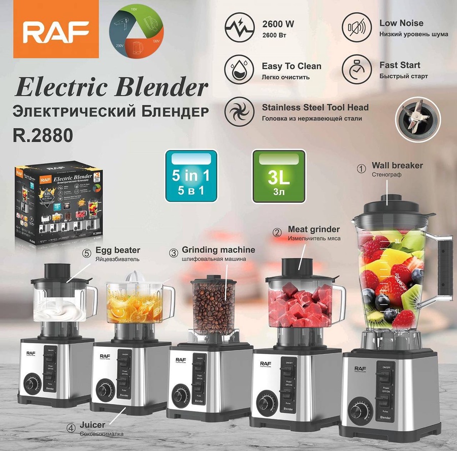 خلاط RAF R.2880 بقوة 2600 واط، 5 في 1 لتحضير العصائر واللحم والبهارات بسهولة، تصميم عملي وسهل التنظيف بأداء قوي.